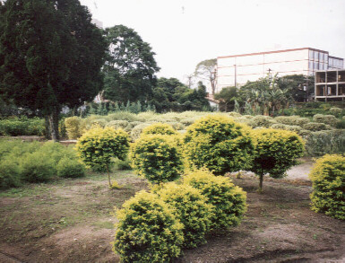 Canteiro mostrando algumas plantas "moldadas" por topearia que é uma técnica de podar as mudas dando-lhes formatos diversos para jardins.